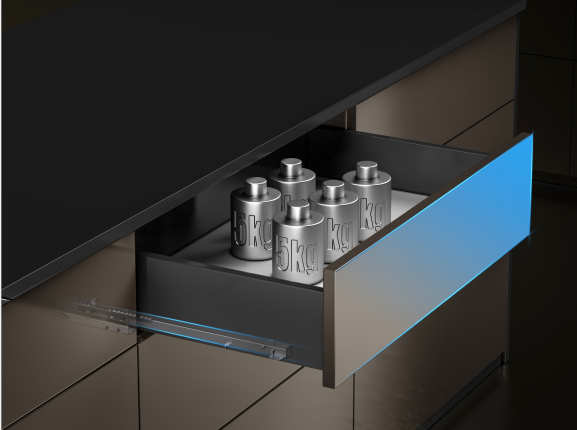 N2全展滑軌,采用兩節(jié)隱藏式設計,使用時抽屜可全拉出,充分利用抽屜空間。緩沖滑軌在開合關閉間,更靜音、更順滑,隱藏式設計讓抽屜更顯簡約之美。